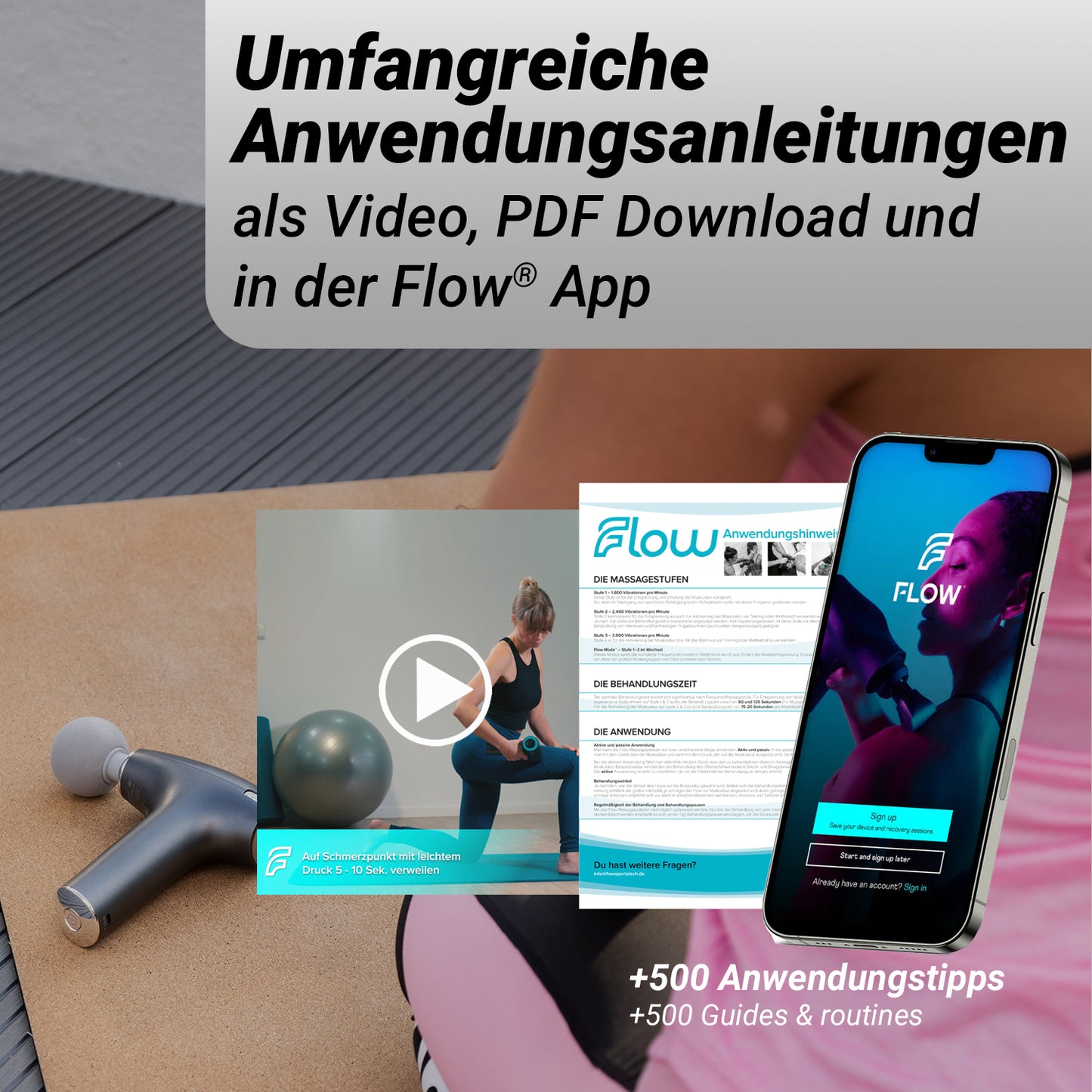 We won't leave you alone when using your Flow® PRO massage gun. For each device you will receive comprehensive instructions in printed form, as a PDF download, video or in the Flow® app