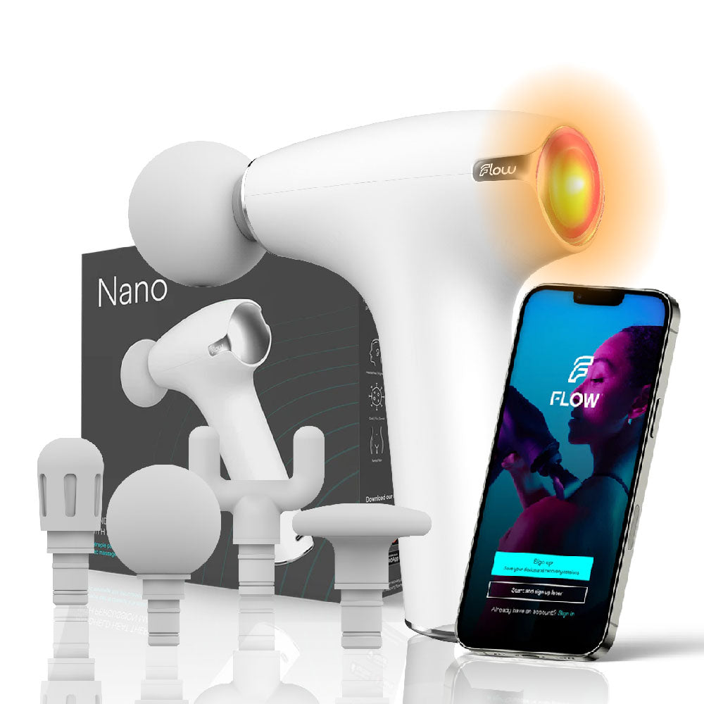 In addition to the massage function, the Flow® NANO massage gun delivers heat therapy via the plate on the back of the device
