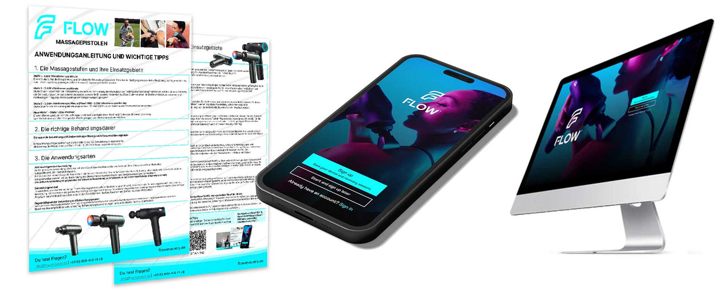 Wir lassen Dich bei der Nutzung Deiner Flow® ELITE Massagepistole nicht alleine. Zu jedem Gerät erhältst Du umfangreiche Anleitungen in gedruckter Form, als PDF Download, Video oder in der Flow® App